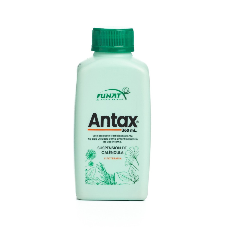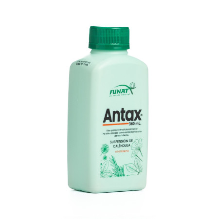 Caléndula Suspensión Antax Frasco 360ml Funat Indicado para su uso tradicional como antiinflamatorio de uso interno. Fitoterapéutico. La información presentada por FARMACIA QUANTA es de carácter informativo para el conocimiento general del producto. Tenga en cuenta que en ningún caso debe usarse para el diagnóstico o tratamiento de alguna afección de la salud. De ninguna manera sustituye el consejo o tratamiento médico profesional. Para más información consulte a su médico.