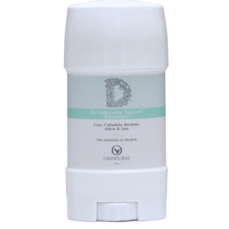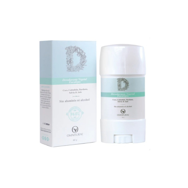 Desodorante Vegetal Frasco 60 g - Eucalipto Omnitural Desodorante vegetal Eucalipto. Con coco, Caléndula, Bardana, Salvia y Anís. Sin aluminio ni alcohol. El sudor regula la temperatura corporal y ayuda a eliminar toxinas. El desodorante Vegetal mantiene estas ventajas sin generar mal olor y manteniendo seca la zona de aplicación. Cumple una función protectora y transpirante por la sinergia de los aceites esenciales, activos minerales y extractos vegetales que contiene, permitiendo el equilibrio del cuerpo. Fórmula libre de aluminio, irgasan (triclosan), petroquímicos, bicarbonato y alcohol. La información presentada por FARMACIA QUANTA es de carácter informativo para el conocimiento general del producto. Tenga en cuenta que en ningún caso debe usarse para el diagnóstico o tratamiento de alguna afección médica. De ninguna manera sustituye el consejo o tratamiento médico profesional. Para más información consulte a su médico.