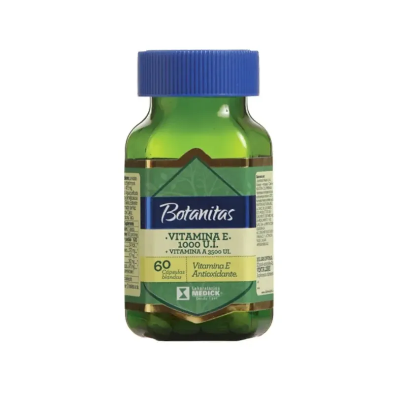 Vitamina E 1000 UI + Vitamina A 3500 UI Frasco 60 Cápsulas Medick El suplemento VITAMINA E + VITAMINA A 3500 UI en forma de cápsulas blandas de LABORATORIOS MEDICK, posee propiedades antioxidantes y de suplementación a la alimentación normal del individuo. La vitamina E antioxidante. La Vitamina A juega un papel fundamental en la visión, en el mantenimiento y regeneración de los huesos y dientes, en la reproducción y en el sistema inmunológico. La información presentada por FARMACIA QUANTA es de carácter informativo para el conocimiento general del producto. Tenga en cuenta que en ningún caso debe usarse para el diagnóstico o tratamiento de alguna afección médica. De ninguna manera sustituye el consejo o tratamiento médico profesional. Para más información consulte a su médico.